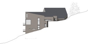 Nybygget er utforma som ei fløy ut mot den frie skråninga, og saman kringset dei eit privat tun framfor pyramiden. Eit opphøgd platå i lé, og med utsyn over fjorden. Tunet er som senteret og utgangspunktet i romprogrammet. Ved å skape utomhusareal og hus i samme program blir uteplassen navet i familiekvardagen, og ikkje bare eit restareal rundt eit midtpunkt.